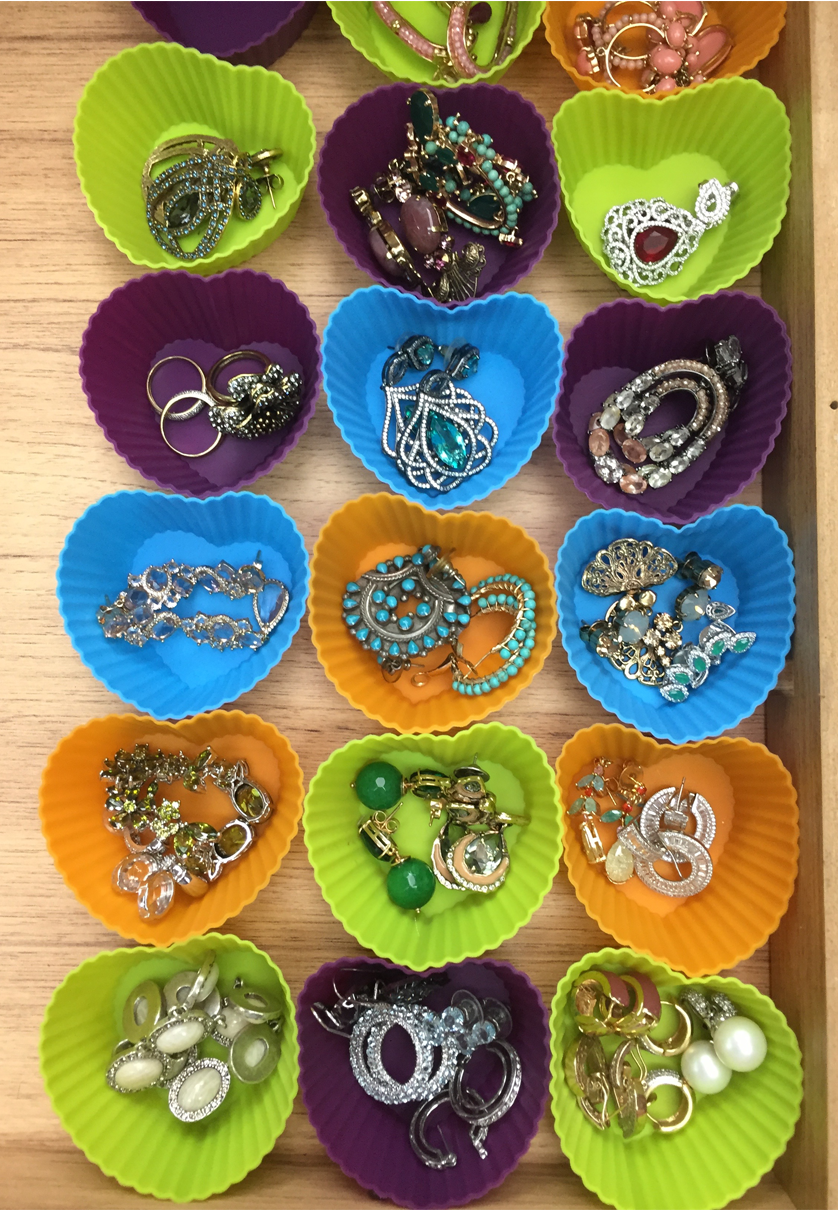 Regra 1 – Tenha tudo a mostra. De preferência, use forminhas de gelo ou painéis de cortiça para os brincos, mas tenha eles olhando para você. Assim, você usa tudo e ganha tempo achando rapidamente o que quer. Pode não fica lá aquela beleza estética, mas pelo menos você vê tudo e usa tudo. Isso é o mais importante.